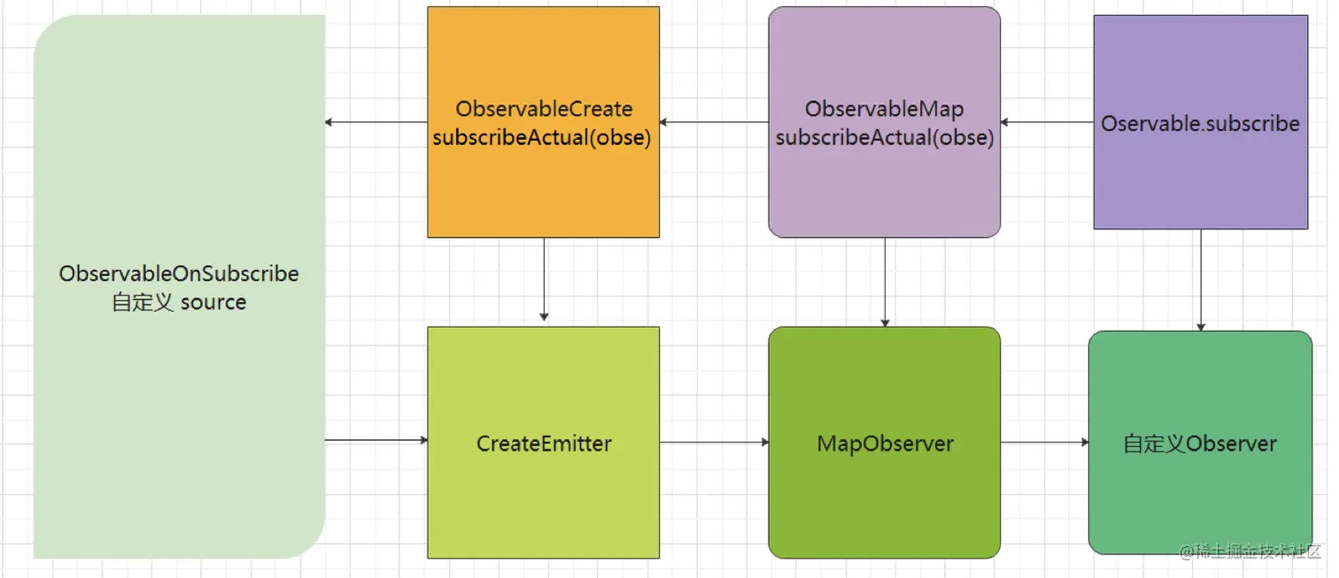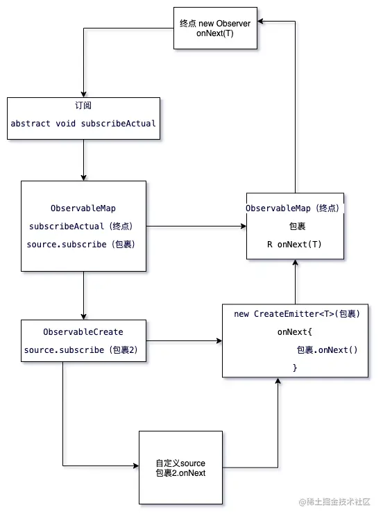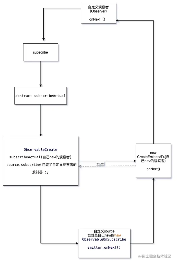 可以看到 new了一个发射器包装了我们传进来的observer 然后自定义的source调用了 subscribe(),这样两端就联系起来了,看下整体流程