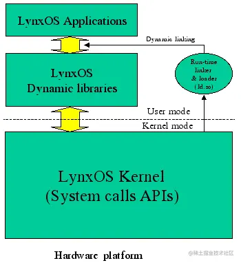 - 第一个解决方案是在内核空间增加额外的软件模块。加在操作系统实现调度策略,硬件中断和程序执行的部分。由于这些实时的软件模块运行在内核空间,操作系统由于代码错误崩溃会影响整个操作系统的可靠性。