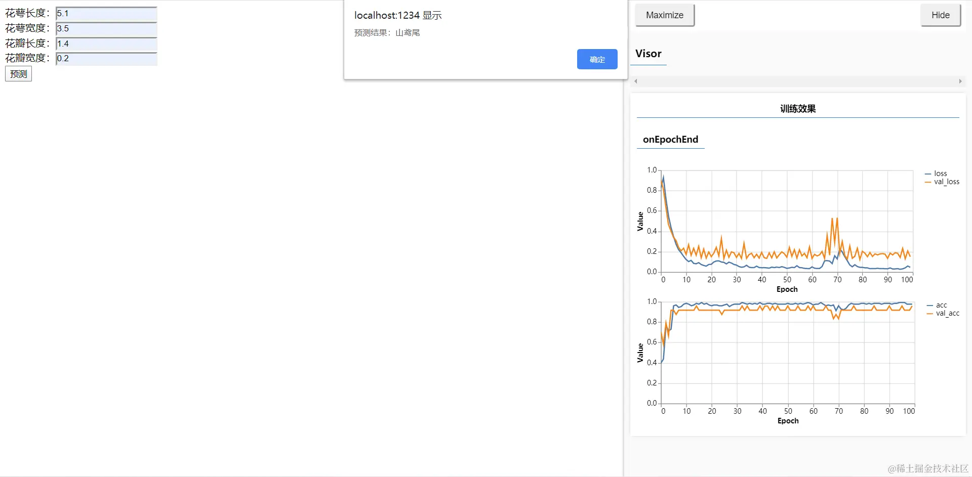 alert(`预测结果:${IRIS_CLASSES[pred.argMax(1).dataSync(0)]}`); // pred.argMax(1)输出的是pred的第二维(0是第一维,1是第二维)的最大值的坐标,不过它输出的是一个Tensor,需要通过dataSync(0)转成普通数据进行显示