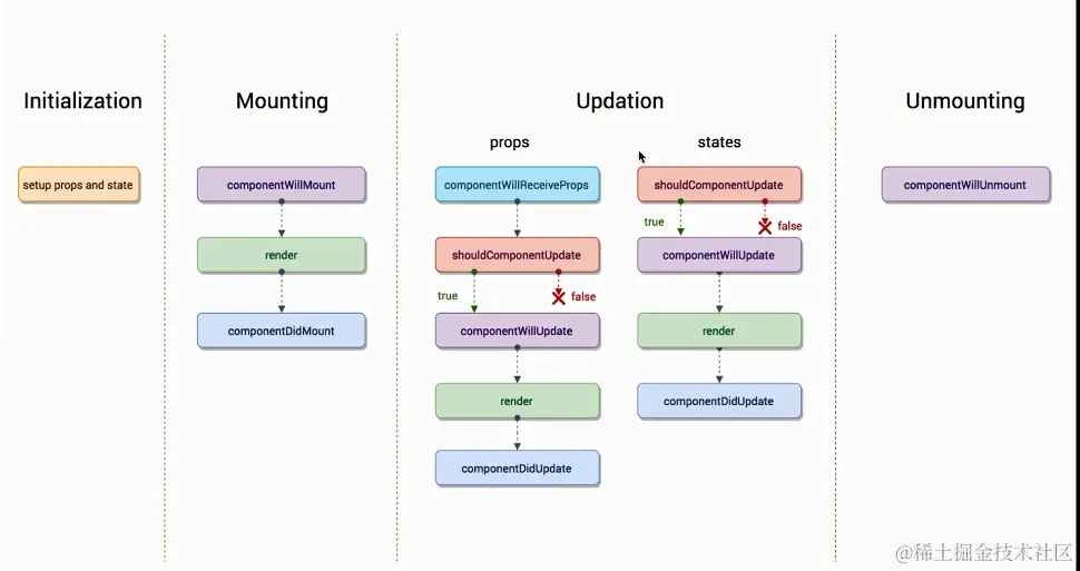 从上图我们可以看出这个生命周期函数非常的对称,componentWilUpdate对应componentDidUpdate,componentWillMount对应componentDidMount;同时也考虑到了因为父组件引发渲染可能要根据props更新state的需要,所以有componentWillReceiveProps。