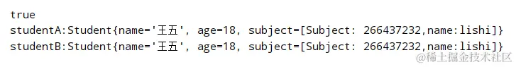 student 和 student2 的基础数据类型的修改互不影响,而引用类型 subject 修改后是会有影响的。