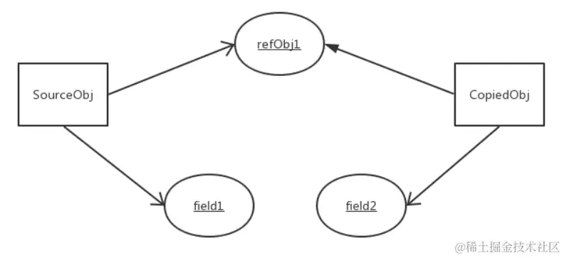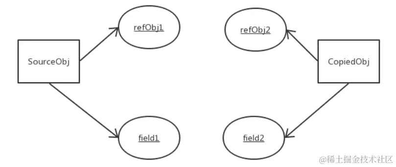 - 对于引用类型,比如数组或者类对象,因为引用类型是引用传递,所以浅拷贝只是把内存地址赋值给了成员变量,它们指向了同一内存空间。改变其中一个,会对另外一个也产生影响。结构图如下: