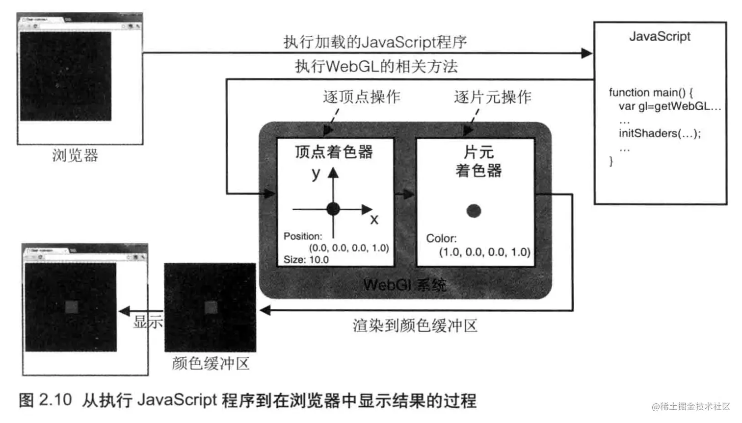 顶点着色器控制着点的位置和大小,片元着色器控制着点的颜色。片元着色器的作用就是处理片元,将其显示在屏幕上。