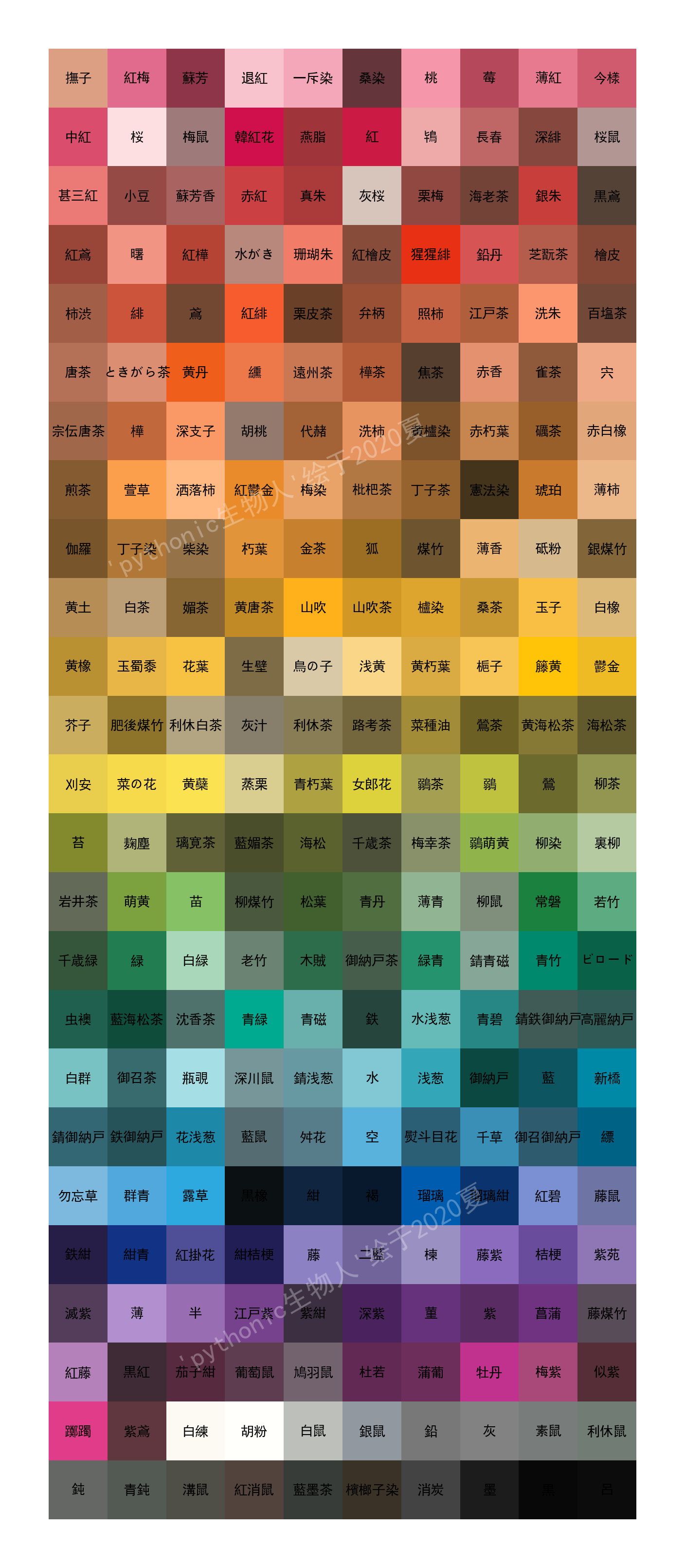 ['撫子', '紅梅', '蘇芳', '退紅', '一斥染', '桑染', '桃', '莓', '薄紅', '今様', '中紅', '桜', '梅鼠', '韓紅花', '燕脂', '紅', '鴇', '長春', '深緋', '桜鼠', '甚三紅', '小豆', '蘇芳香', '赤紅', '真朱', '灰桜', '栗梅', '海老茶', '銀朱', '黒鳶', '紅鳶', '曙', '紅樺', '水がき', '珊瑚朱', '紅檜皮', '猩猩緋', '鉛丹', '芝翫茶', '檜皮', '柿渋', '緋', '鳶', '紅緋', '栗皮茶', '弁柄', '照柿', '江戸茶', '洗朱', '百塩茶', '唐茶', 'ときがら茶', '黄丹', '纁', '遠州茶', '樺茶', '焦茶', '赤香', '雀茶', '宍', '宗伝唐茶', '樺', '深支子', '胡桃', '代赭', '洗柿', '黄櫨染', '赤朽葉', '礪茶', '赤白橡', '煎茶', '萱草', '洒落柿', '紅鬱金', '梅染', '枇杷茶', '丁子茶', '憲法染', '琥珀', '薄柿', '伽羅', '丁子染', '柴染', '朽葉', '金茶', '狐', '煤竹', '薄香', '砥粉', '銀煤竹', '黄土', '白茶', '媚茶', '黄唐茶', '山吹', '山吹茶', '櫨染', '桑茶', '玉子', '白橡', '黄橡', '玉蜀黍', '花葉', '生壁', '鳥の子', '浅黄', '黄朽葉', '梔子', '籐黄', '鬱金', '芥子', '肥後煤竹', '利休白茶', '灰汁', '利休茶', '路考茶', '菜種油', '鶯茶', '黄海松茶', '海松茶', '刈安', '菜の花', '黄蘗', '蒸栗', '青朽葉', '女郎花', '鶸茶', '鶸', '鶯', '柳茶', '苔', '麹塵', '璃寛茶', '藍媚茶', '海松', '千歳茶', '梅幸茶', '鶸萌黄', '柳染', '裏柳', '岩井茶', '萌黄', '苗', '柳煤竹', '松葉', '青丹', '薄青', '柳鼠', '常磐', '若竹', '千歳緑', '緑', '白緑', '老竹', '木賊', '御納戸茶', '緑青', '錆青磁', '青竹', 'ビロード', '虫襖', '藍海松茶', '沈香茶', '青緑', '青磁', '鉄', '水浅葱', '青碧', '錆鉄御納戸', '高麗納戸', '白群', '御召茶', '瓶覗', '深川鼠', '錆浅葱', '水', '浅葱', '御納戸', '藍', '新橋', '錆御納戸', '鉄御納戸', '花浅葱', '藍鼠', '舛花', '空', '熨斗目花', '千草', '御召御納戸', '縹', '勿忘草', '群青', '露草', '黒橡', '紺', '褐', '瑠璃', '瑠璃紺', '紅碧', '藤鼠', '鉄紺', '紺青', '紅掛花', '紺桔梗', '藤', '二藍', '楝', '藤紫', '桔梗', '紫苑', '滅紫', '薄', '半', '江戸紫', '紫紺', '深紫', '菫', '紫', '菖蒲', '藤煤竹', '紅藤', '黒紅', '茄子紺', '葡萄鼠', '鳩羽鼠', '杜若', '蒲葡', '牡丹', '梅紫', '似紫', '躑躅', '紫鳶', '白練', '胡粉', '白鼠', '銀鼠', '鉛', '灰', '素鼠', '利休鼠', '鈍', '青鈍', '溝鼠', '紅消鼠', '藍墨茶', '檳榔子染', '消炭', '墨', '黒', '呂']