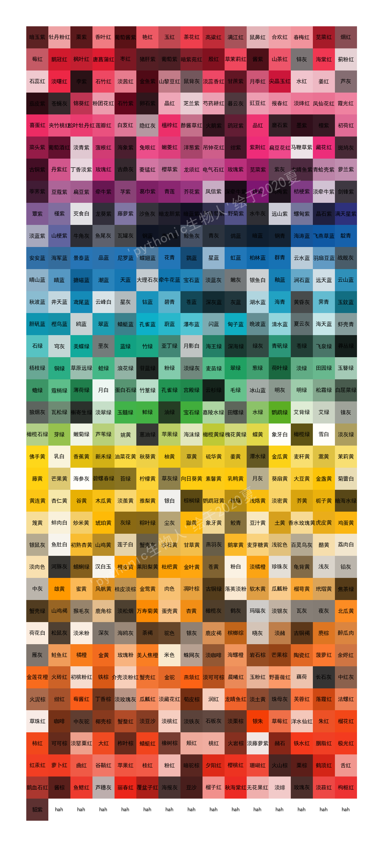['暗玉紫', '牡丹粉红', '栗紫', '香叶红', '葡萄酱紫', '艳红', '玉红', '茶花红', '高粱红', '满江红', '鼠鼻红', '合欢红', '春梅红', '苋菜红', '烟红', '莓红', '鹅冠红', '枫叶红', '唐菖蒲红', '枣红', '猪肝紫', '葡萄紫', '暗紫苑红', '殷红', '草茉莉红', '酱紫', '山茶红', '锌灰', '海棠红', '蓟粉红', '石蕊红', '淡曙红', '李紫', '石竹红', '淡茜红', '金鱼紫', '山黎豆红', '鼠背灰', '淡蕊香红', '甘蔗紫', '月季红', '尖晶玉红', '水红', '姜红', '芦灰', '茄皮紫', '苍蝇灰', '锦葵红', '粉团花红', '石竹紫', '卵石紫', '晶红', '芝兰紫', '芍药耕红', '暮云灰', '豇豆红', '报春红', '淡绛红', '凤仙花红', '霞光红', '喜蛋红', '夹竹桃红', '松叶牡丹红', '莲瓣红', '白芨红', '隐红灰', '榲桲红', '酢酱草红', '火鹅紫', '鹞冠紫', '品红', '磨石紫', '墨紫', '檀紫', '初荷红', '菜头紫', '葡萄酒红', '淡青紫', '菠根红', '海象紫', '兔眼红', '嫩菱红', '洋葱紫', '吊钟花红', '绀紫', '紫荆红', '扁豆花红', '马鞭草紫', '藏花红', '斑鸠灰', '古铜紫', '丹紫红', '丁香淡紫', '玫瑰红', '古鼎灰', '菱锰红', '樱草紫', '龙须红', '电气石红', '玫瑰紫', '苋菜紫', '紫灰', '龙睛鱼紫', '青蛤壳紫', '萝兰紫', '荸荠紫', '豆蔻紫', '扁豆紫', '牵牛紫', '芓紫', '葛巾紫', '青莲', '芥花紫', '凤信紫', '深牵牛紫', '魏紫', '乌梅紫', '桔梗紫', '淡牵牛紫', '剑锋紫', '蕈紫', '槿紫', '芡食白', '龙葵紫', '藤萝紫', '沙鱼灰', '暗龙胆紫', '暗蓝紫', '野葡萄紫', '野菊紫', '水牛灰', '远山紫', '螺甸紫', '晶石紫', '满天星紫', '淡蓝紫', '山梗紫', '牛角灰', '鱼尾灰', '瓦罐灰', '钢蓝', '燕颔蓝', '鲸鱼灰', '青灰', '鸽蓝', '暗蓝', '钢青', '海涛蓝', '飞燕草蓝', '靛青', '安安蓝', '海军蓝', '景泰蓝', '品蓝', '尼罗蓝', '蝶翅蓝', '花青', '鷃蓝', '星蓝', '虹蓝', '柏林蓝', '群青', '云水蓝', '羽扇豆蓝', '战舰灰', '晴山蓝', '睛蓝', '搪磁蓝', '潮蓝', '天蓝', '大理石灰', '牵牛花蓝', '宝石蓝', '淡蓝灰', '嫩灰', '银鱼白', '釉蓝', '涧石蓝', '远天蓝', '云山蓝', '秋波蓝', '井天蓝', '鸢尾蓝', '云峰白', '星灰', '钴蓝', '碧青', '苍蓝', '深灰蓝', '灰蓝', '湖水蓝', '海青', '黄昏灰', '霁青', '玉鈫蓝', '胆矾蓝', '樫鸟蓝', '鸥蓝', '翠蓝', '蜻蜓蓝', '孔雀蓝', '蔚蓝', '瀑布蓝', '闪蓝', '甸子蓝', '晚波蓝', '清水蓝', '夏云灰', '海天蓝', '虾壳青', '石绿', '穹灰', '美蝶绿', '垩灰', '蓝绿', '竹绿', '亚丁绿', '月影白', '海王绿', '深海绿', '绿灰', '青矾绿', '苍绿', '飞泉绿', '莽丛绿', '梧枝绿', '铜绿', '草原远绿', '蛙绿', '浪花绿', '苷蓝绿', '粉绿', '淡绿灰', '麦苗绿', '翠绿', '葱绿', '荷叶绿', '淡绿', '田园绿', '玉簪绿', '蟾绿', '蔻梢绿', '薄荷绿', '月白', '蛋白石绿', '竹篁绿', '孔雀绿', '宫殿绿', '云杉绿', '毛绿', '冰山蓝', '明灰', '明绿', '松霜绿', '白屈菜绿', '狼烟灰', '瓦松绿', '槲寄生绿', '淡翠绿', '玉髓绿', '鲜绿', '油绿', '宝石绿', '嘉陵水绿', '田螺绿', '水绿', '鹦鹉绿', '艾背绿', '艾绿', '镍灰', '橄榄石绿', '芽绿', '嫩菊绿', '芦苇绿', '姚黄', '蒽油绿', '苹果绿', '海沬绿', '橄榄黄绿', '槐花黄绿', '蝶黄', '象牙白', '橄榄绿', '雪白', '淡灰绿', '佛手黄', '乳白', '香蕉黄', '新禾绿', '油菜花黄', '秋葵黄', '柚黄', '草黄', '硫华黄', '姜黄', '潭水绿', '金瓜黄', '麦秆黄', '蒿黄', '茉莉黄', '藤黄', '芒果黄', '海参灰', '碧螺春绿', '苔绿', '柠檬黄', '草灰绿', '向日葵黄', '素馨黄', '乳鸭黄', '月灰', '葵扇黄', '大豆黄', '金盏黄', '菊蕾白', '黄连黄', '杏仁黄', '谷黄', '木瓜黄', '淡茧黄', '雅梨黄', '银白', '棕榈绿', '鹦鹉冠黄', '枯绿', '浅烙黄', '淡密黄', '芥黄', '栀子黄', '暗海水绿', '篾黄', '蚌肉白', '炒米黄', '琥珀黄', '灰绿', '粽叶绿', '尘灰', '鼬黄', '象牙黄', '鲛青', '豆汁黄', '土黄', '香水玫瑰黄', '虎皮黄', '鸡蛋黄', '银鼠灰', '鱼肚白', '初熟杏黄', '山鸡黄', '莲子白', '蟹壳灰', '沙石黄', '甘草黄', '燕羽灰', '鹅掌黄', '麦芽糖黄', '浅驼色', '百灵鸟灰', '酪黄', '荔肉白', '淡肉色', '河豚灰', '蜴蜊绿', '汉白玉', '橙皮黄', '莱阳梨黄', '枇杷黄', '金叶黄', '苍黄', '粉白', '淡橘橙', '珍珠灰', '龟背黄', '浅灰', '铅灰', '中灰', '雄黄', '蜜黄', '风帆黄', '桂皮淡棕', '金莺黄', '肉色', '凋叶棕', '古铜绿', '落英淡粉', '软木黄', '瓜瓤粉', '榴萼黄', '玳瑁黄', '焦茶绿', '蟹壳绿', '山鸡褐', '猴毛灰', '鹿角棕', '淡松烟', '万寿菊黄', '蛋壳黄', '杏黄', '橄榄灰', '鹤灰', '玛瑙灰', '淡银灰', '瓦灰', '夜灰', '北瓜黄', '荷花白', '松鼠灰', '淡米粉', '深灰', '海鸥灰', '茶褐', '驼色', '银灰', '鹿皮褐', '槟榔综', '晓灰', '淡赭', '古铜褐', '麂棕', '醉瓜肉', '雁灰', '鲑鱼红', '橘橙', '金黄', '玫瑰粉', '美人焦橙', '米色', '蛛网灰', '淡咖啡', '海螺橙', '岩石棕', '芒果棕', '陶瓷红', '菠萝红', '余烬红', '金莲花橙', '火砖红', '初桃粉红', '铁棕', '介壳淡粉红', '蟹壳红', '金驼', '燕颔红', '淡可可棕', '晨曦红', '玉粉红', '野蔷薇红', '藕荷', '长石灰', '中红灰', '火泥棕', '绀红', '莓酱红', '丁香棕', '淡玫瑰灰', '瓜瓤红', '淡藏花红', '筍皮棕', '润红', '龙睛鱼红', '淡土黄', '珠母灰', '芙蓉红', '落霞红', '法螺红', '草珠红', '咖啡', '中灰驼', '椰壳棕', '蟹蝥红', '淡豆沙', '淡桃红', '淡铁灰', '石板灰', '淡栗棕', '银朱', '