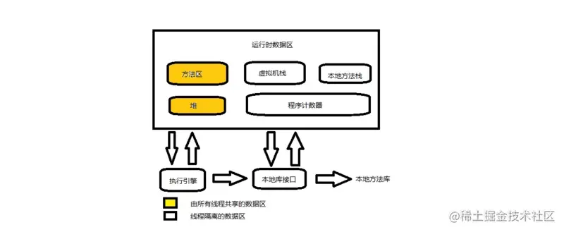 根据规范我们可以大概的画出JVM运行实数据区域(执行引擎、本地库接口在后面的文章中会进行详细介绍)。
