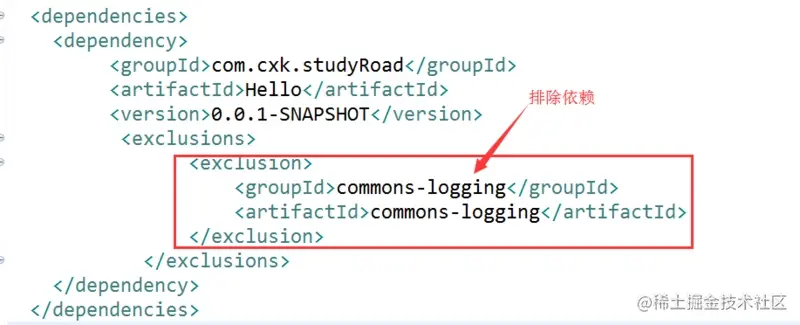 但是现在我并不想要commons-logging这个jar包该怎么办呢? 我们可以排除依赖: