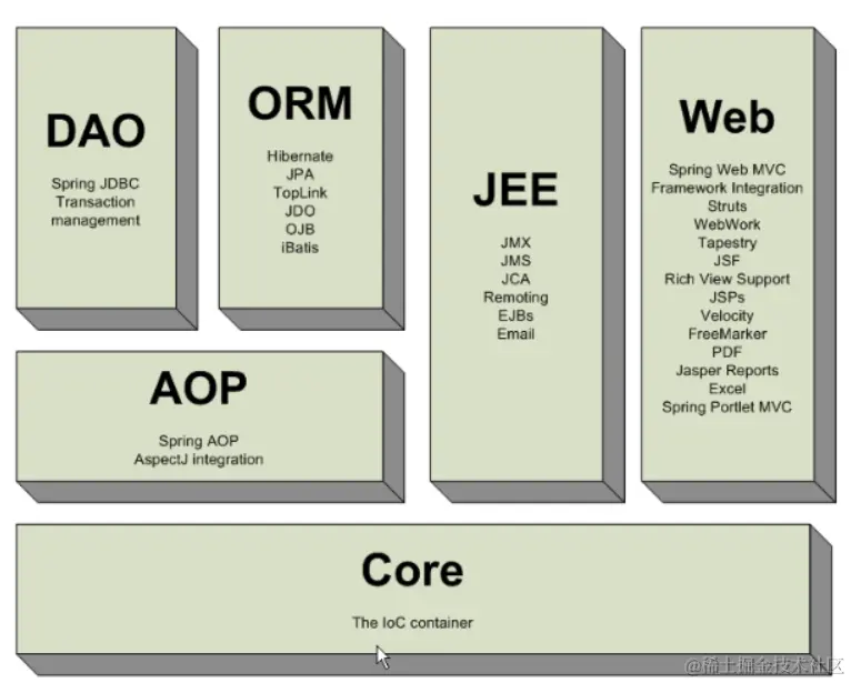 - 核心容器:核心容器提供 Spring 框架的基本功能。核心容器的主要组件是 BeanFactory,它是工厂模式的实现。BeanFactory 使用控制反转 (IOC)模式将应用程序的配置和依赖性规范与实际的应用程序代码分开。