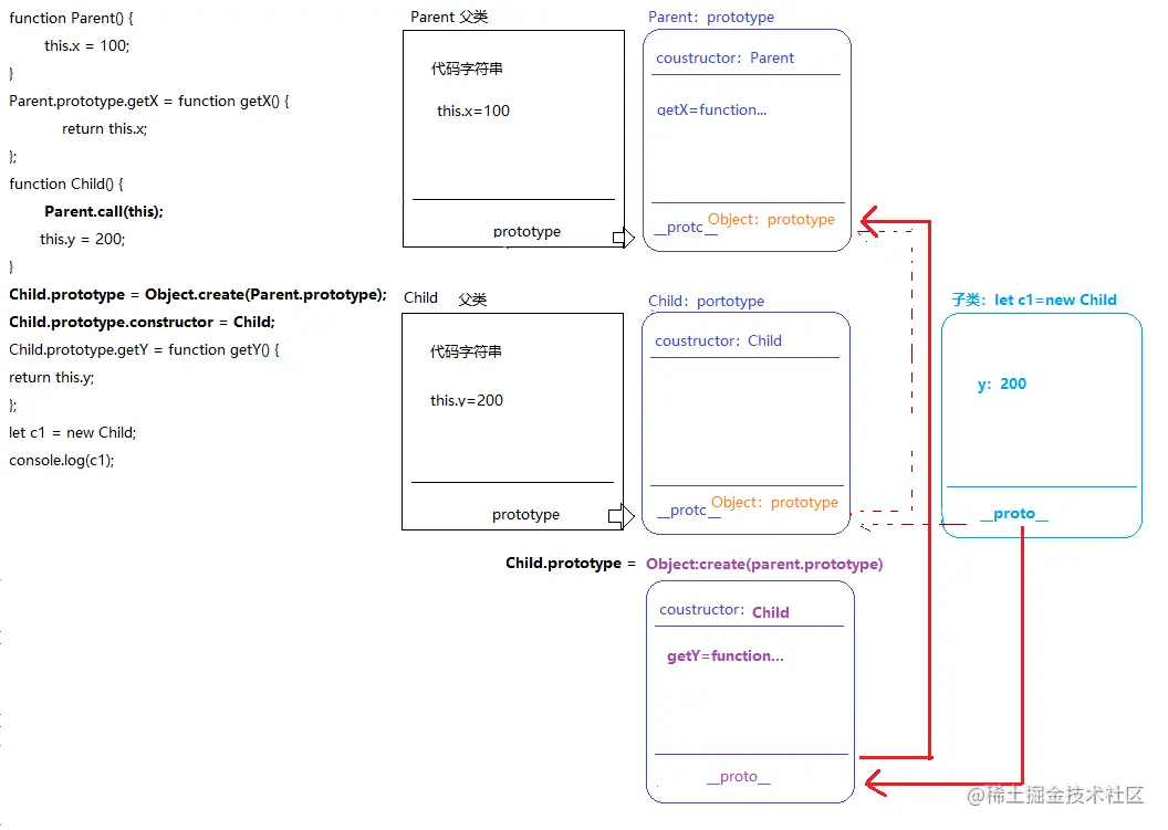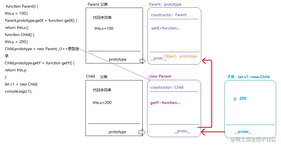 function Parent() { this.x = 100; } Parent.prototype.getX = function getX() { return this.x; }; function Child() { this.y = 200; } //让子类的实例同时也具备父类中私有的属性和公共的方法 Child.prototype = new Parent; //=>原型继承 Child.prototype.getY = function getY() { return this.y; }; let c1 = new Child; console.log(c1);