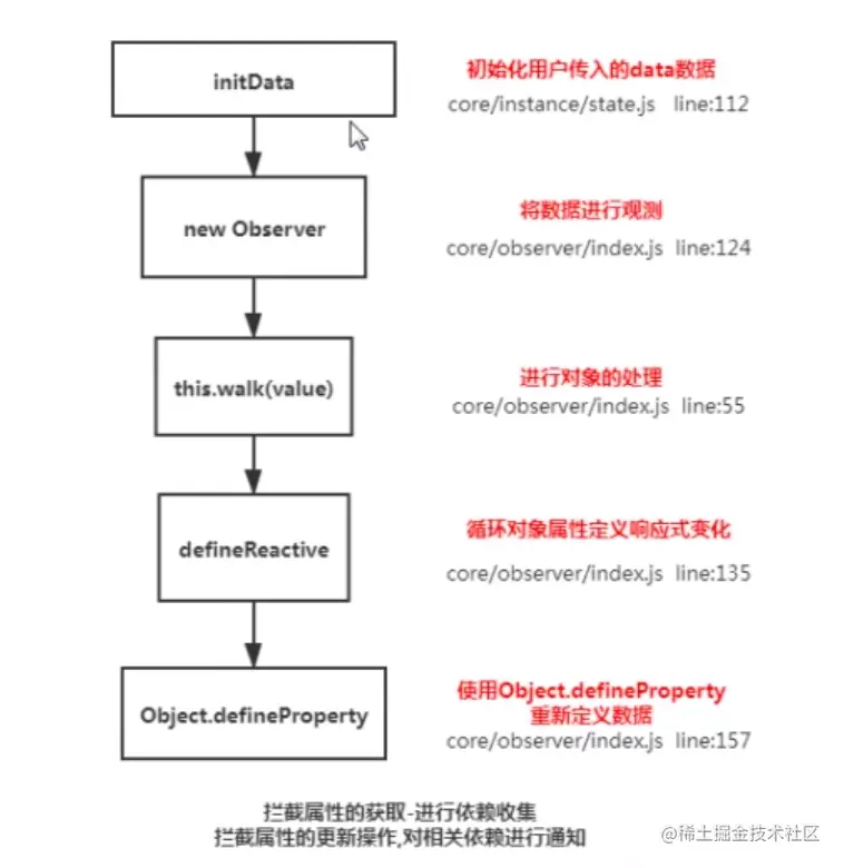 Observe类中,实例化后会注册Dep()实例,Array.isArray(value)判断是否是数组,是的话执行observeArray,还是遍历执行observe函数,深度观察数组。对象则直接调用defineReactive(obj, key),即重新定义对象数据// observe/index.js class Observer { value: any; dep: Dep; vmCount: number; // number of vms that have this object as root $data constructor (value: any) { this.value = value this.dep = new Dep() this.vmCount = 0 def(value, '__ob__', this) // Array.isArray(value)判断是否是数组,是的话执行observeArray,还是遍历执行observe函数,对象则直接调用defineReactive(obj, key) if (Array.isArray(value)) { if (hasProto) { protoAugment(value, arrayMethods) } else { copyAugment(value, arrayMethods, arrayKeys) } this.observeArray(value) // 深度观察数组 } else { this.walk(value) } } /** * Walk through all properties and convert them into * getter/setters. This method should only be called when * value type is Object. */ walk (obj: Object) { const keys = Object.keys(obj) for (let i = 0; i < keys.length; i++) { defineReactive(obj, keys[i]) // 重新定义对象类型-> 响应式数据 } } /** * Observe a list of Array items. */ observeArray (items: Array<any>) { for (let i = 0, l = items.length; i < l; i++) { observe(items[i]) } } } -