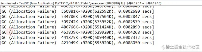 若不断的创建大对象,由于该对象的生命周期只在for循环里,所以gc来得及回收,控制台显示的就是不断的占用内存,不断地回收垃圾