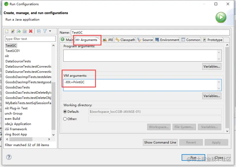 在运行前点Run Configurations 填写参数 -XX:+PrintGC