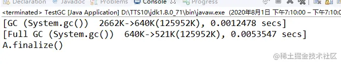在A类中重写finallize方法,输出一行语句,此方法是在对象的声明周期结束前执行,可以看出对象是否被回收。