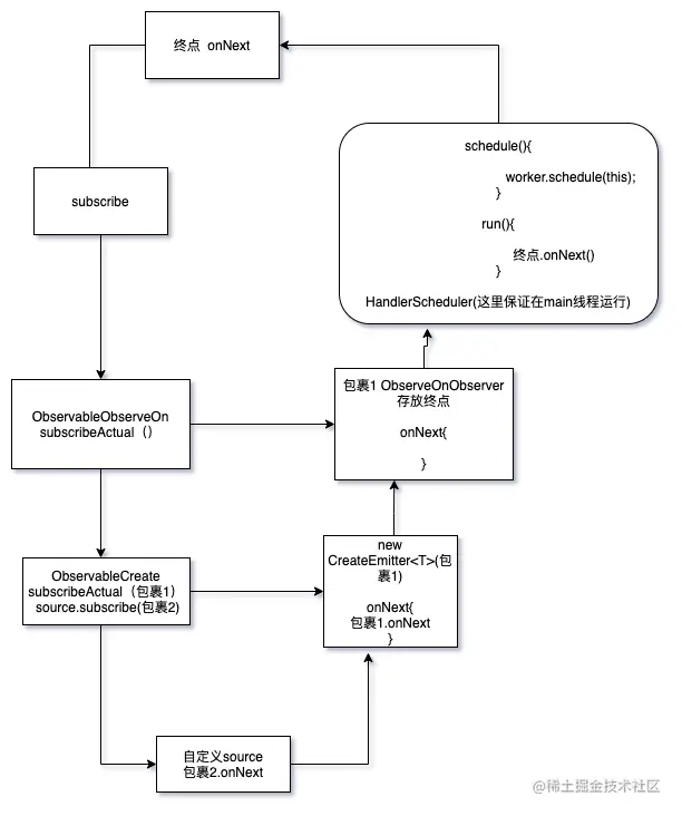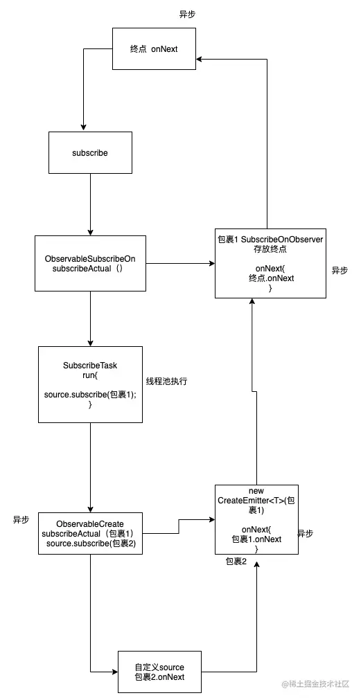 就是这样一种流程,我们再来看.subscribe 其实也就相当于是SubscribeOnObserver.subscribe,点进去看看 其实这个流程和前面分析的流程都是一样的 最终会走到