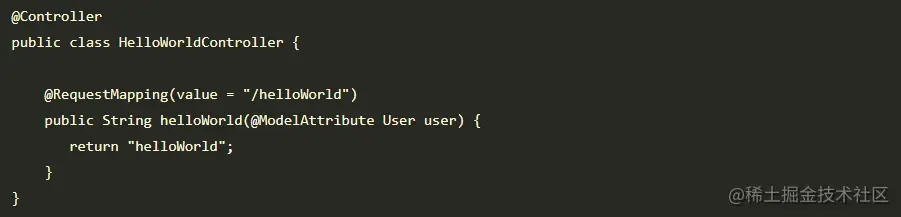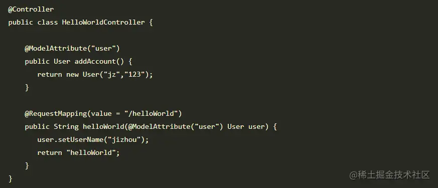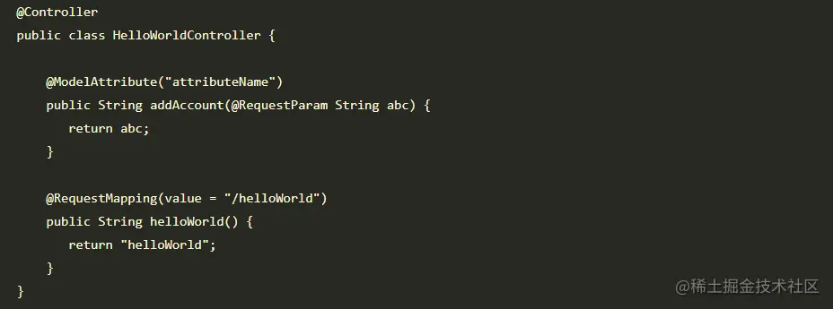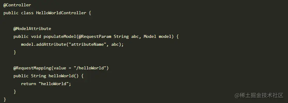 - 这个例子,在获得请求/helloWorld 后,populateModel方法在helloWorld方法之前先被调用,它把请求参数(/helloWorld?abc=text)加入到一个名为attributeName的model属性中,在它执行后 helloWorld被调用,返回视图名helloWorld和model已由@ModelAttribute方法生产好了。
