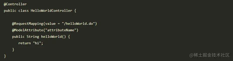 说明:这时这个方法的返回值并不是表示一个视图名称,而是model属性的值,视图名称由RequestToViewNameTranslator根据请求”/helloWorld.do”转换为逻辑视图helloWorld。 Model属性名称由@ModelAttribute("attributeName")指定,相当于在request中封装了key=attributeName,value=hi。