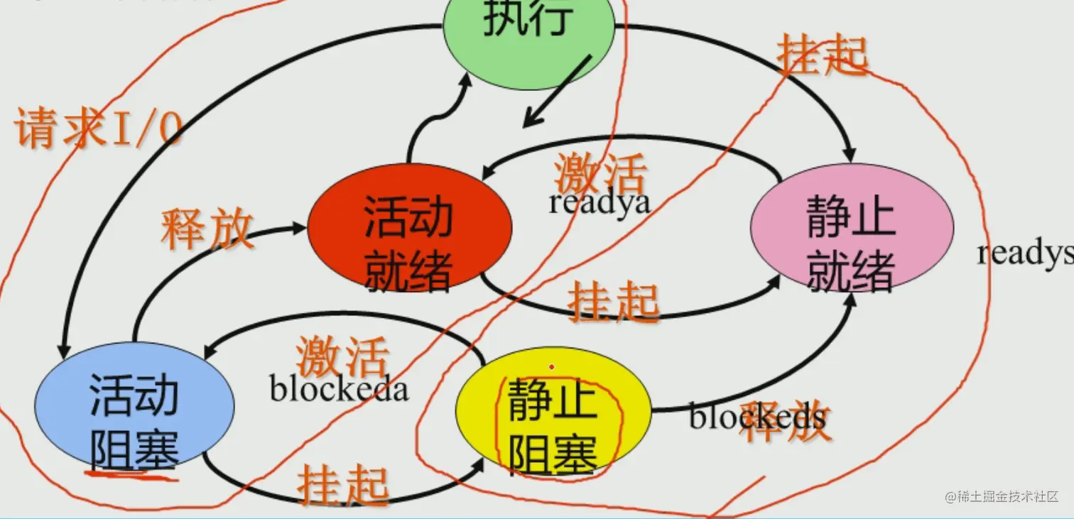 引入挂起状态后,增加了挂起状态(静止状态)到非挂起状态(活动状态)的转换,或者相反