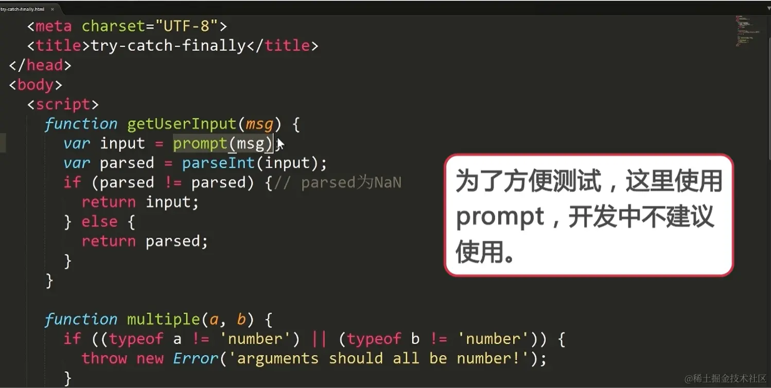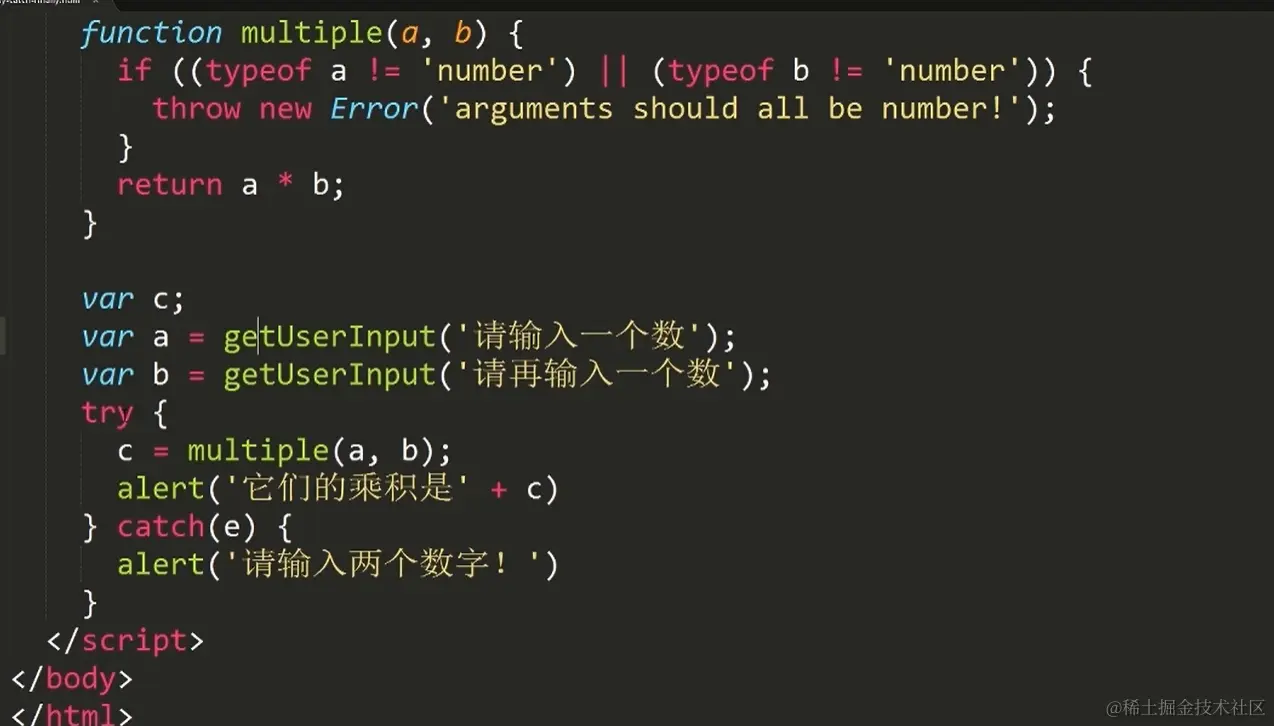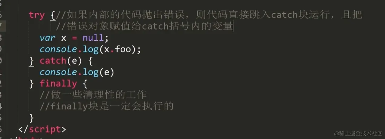 如果走到了throw,会往外找最近的try语句(错误的冒泡),扔出的错误对象会被catch变量接住