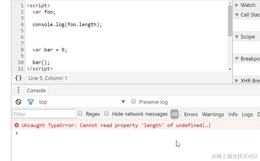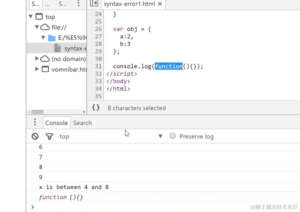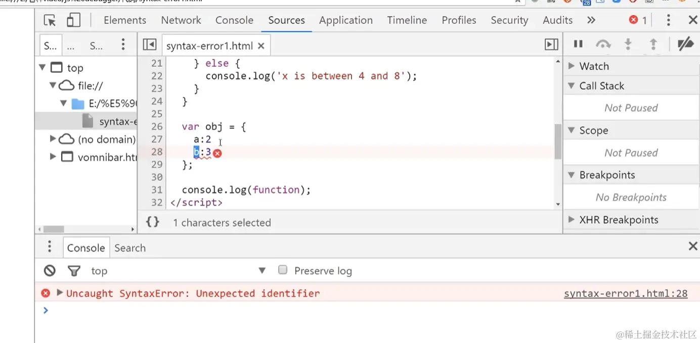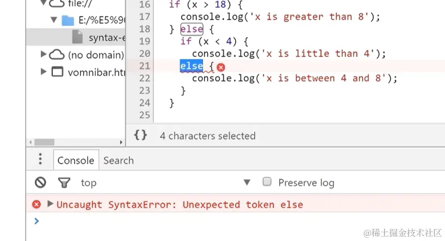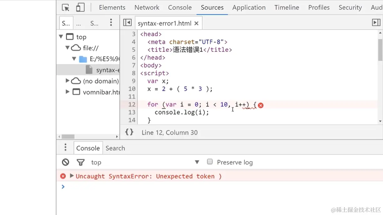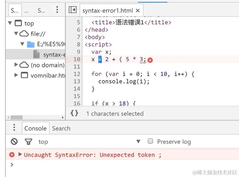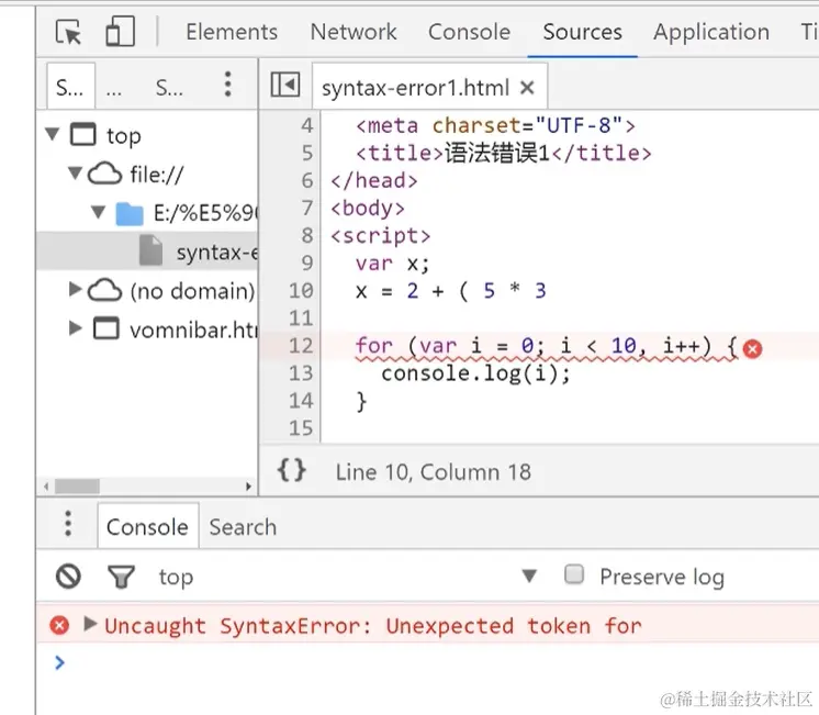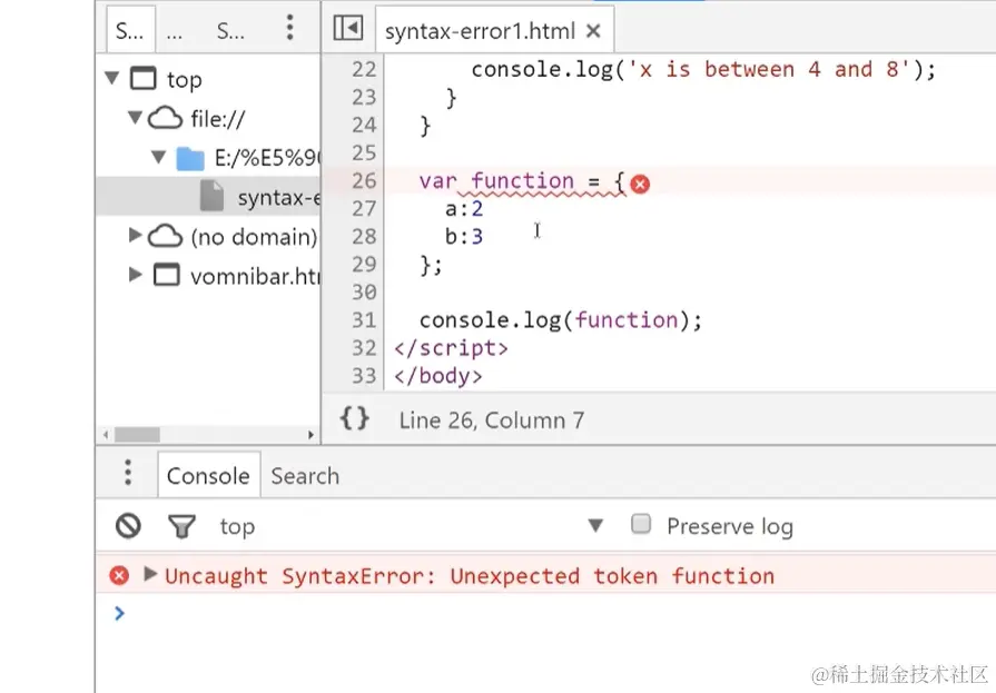 不符合Js语法的错误,出现语法错误,控制台会进行报错并告知出错的行号(但行号不一定准确)