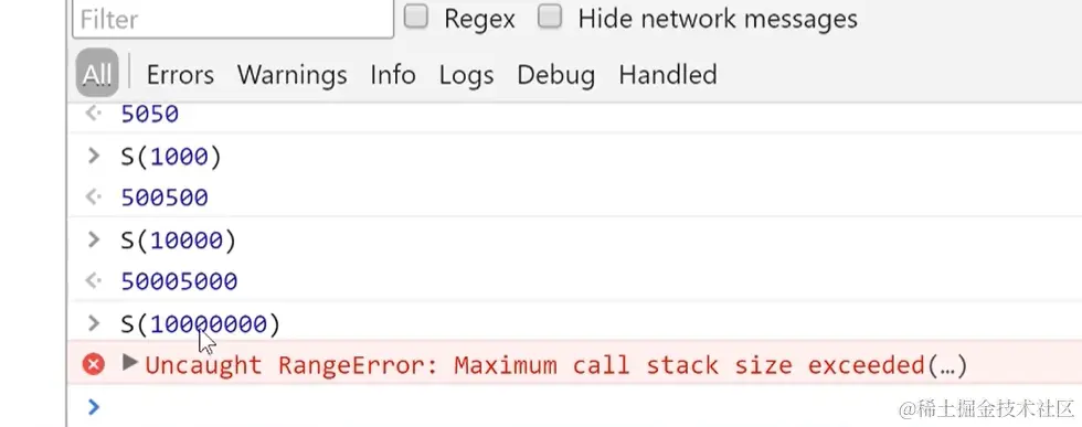 - RangeError:不太常见,一般会在递归爆栈时触发,即递归深度太深(浏览器一般最多1024层)