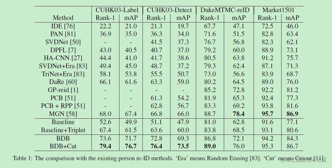 BDB在CUHK03, DUKE和market1501数据集上的对比