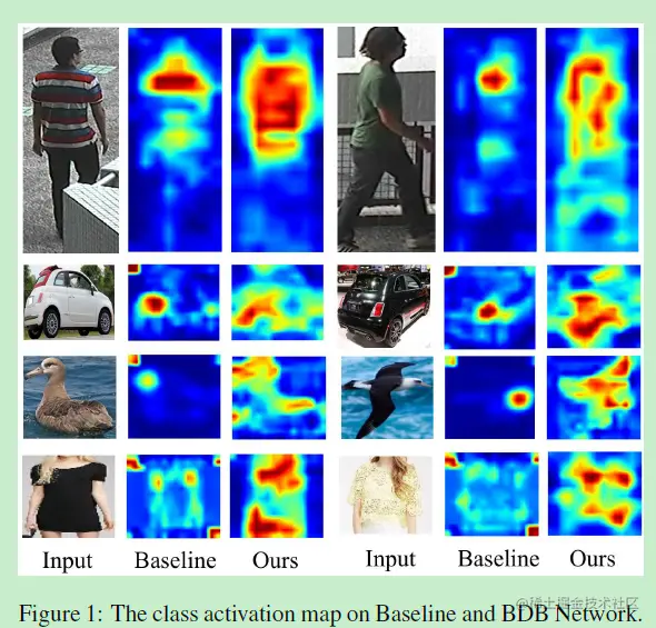 BDB与baseline的activation map可视化对比,可以看到BDB激活区域更多,分布更均匀,而baseline只专注于主要的身体部分。