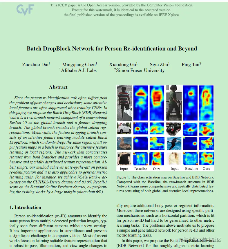 2019的ICCV,Batch DropBlock Network for Person Re-identification and Beyond,早期也叫做Batch Feature Erasing for Person Re-identification and Beyond(两个版本几乎一样),我以Batch DropBlock Network为准。文章[1]提出了Batch DropBlock (BDB) Network,该网络包含一个注意力特征学习模块batch dropblock,其在feature map中相同区域进行随机去除,迫使网络增强对局部特征的学习。