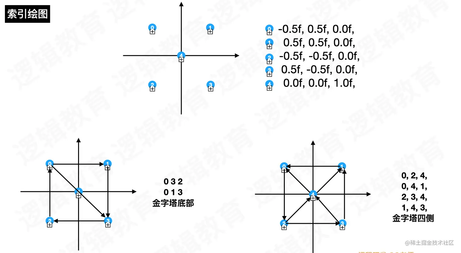 1.只需要传入5个顶点的位置和绘制不同面的连接方式.