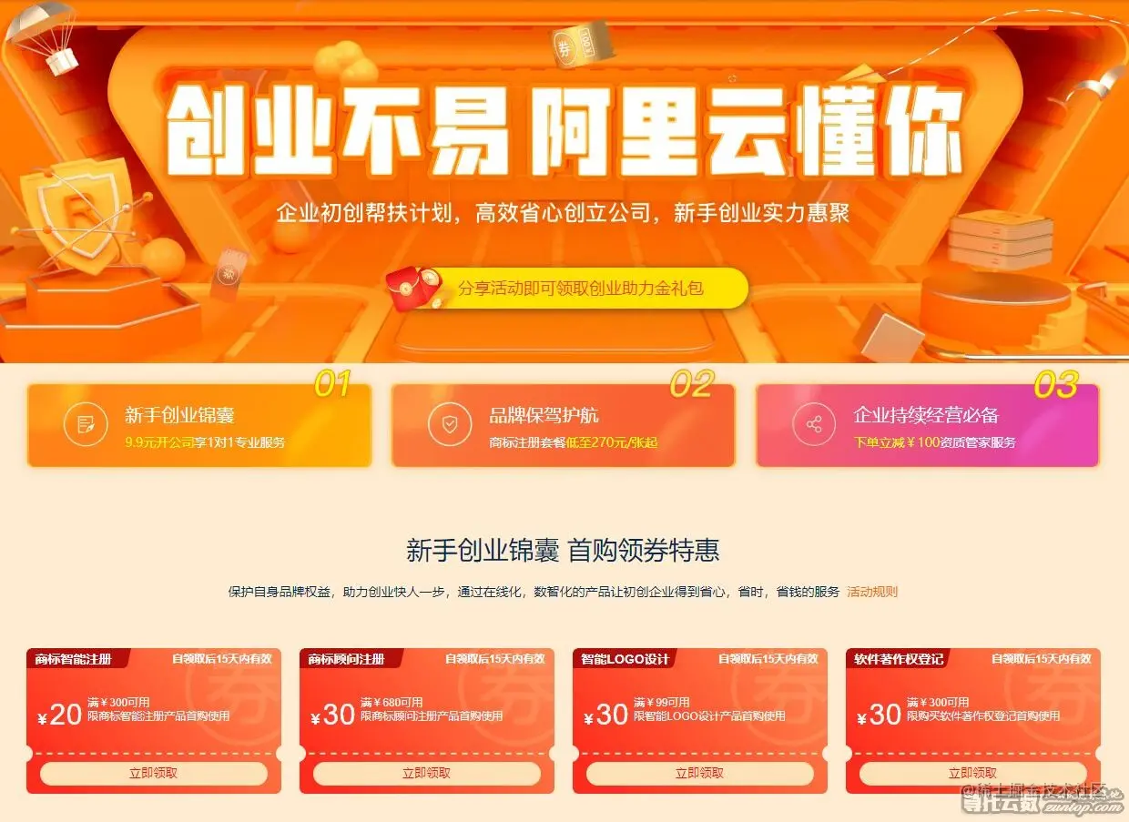 作为初期创业者,各方面的资金压力和精神压力都是极大的,创业不易,阿里云懂你!阿里云为扶持初创企业,特推出企业初创帮扶计划,帮你高效省心创立公司,并且仅9.9元即可完成,活动直达链接:tm.aliyun.com/channel/pro…