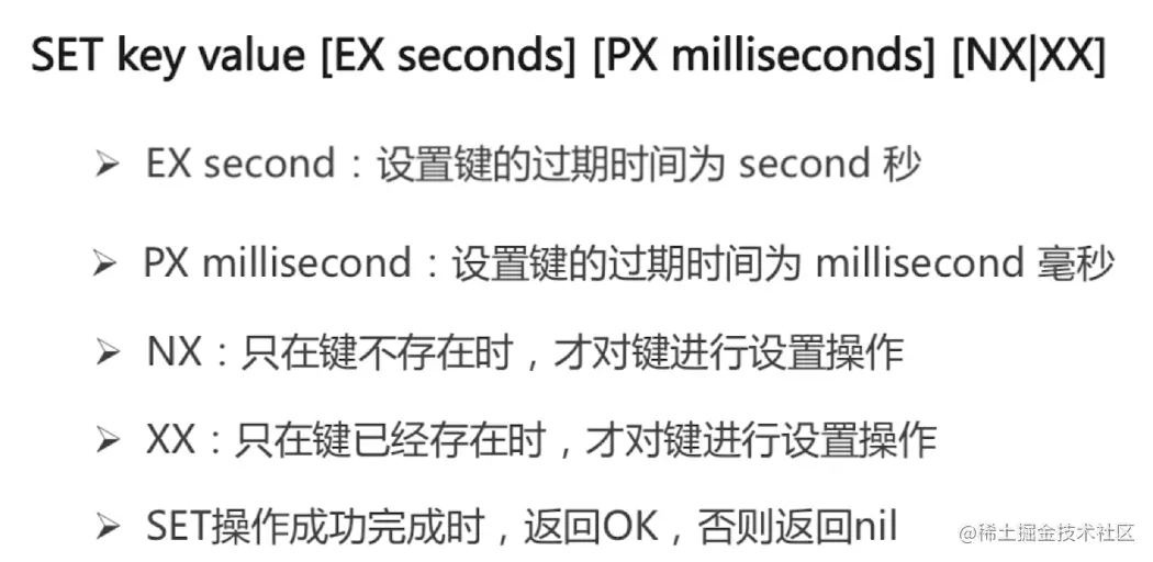 - NX:表示只有 key 不存在的时候才会设置成功。(如果此时 redis 中存在这个 key,那么设置失败,返回 nil)不存在才成功很关键.
