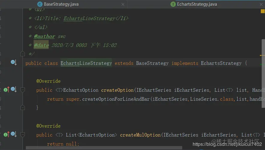 注:1.这里主要看有注释的方法 因为参数是最全的 2.关于IEchartSeries ,EchartsStrategy 这两类,IEchartSeries 是针对series的数据处理 或添加修改样式(毕竟每个公司 /每个系统业务多多少少会有些不同) ,EchartsStrategy 这个是自定义你自己业务需求的策略(需要继承EchartsStrategy ,这个完全是重新定义这个方法 IEchartSeries 再次不起作用 除非你自动代码回调到它)