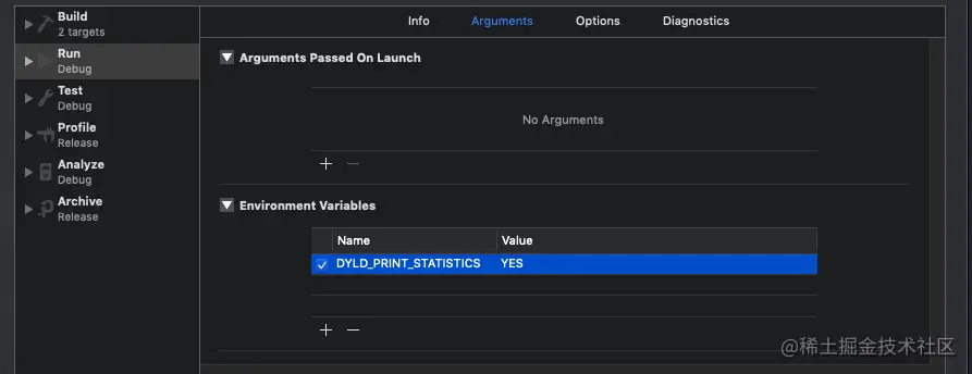 添加变量 Name DYLD_PRINT_STATISTICS Value 设置为 YES
