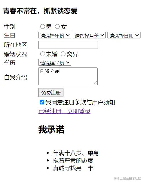 主要利用表格标签、列表标签以及表单标签完成一个非常简陋的注册页面。