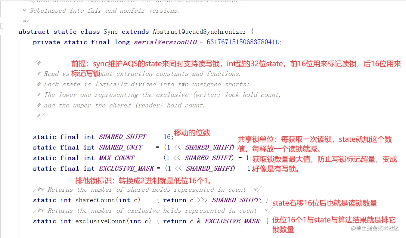 Int型的state是32位,把state的前16位作为读锁的统计,后16位作为写锁的统计。