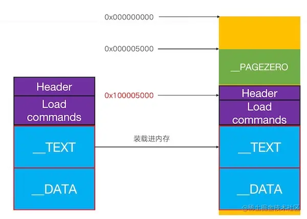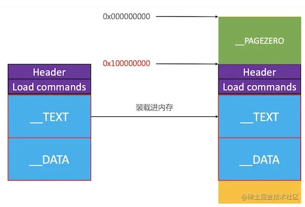 在未使用ASLR技术时,Mach-O被加载进内存后,是从地址0x000000000开始存放,前文说到,Mach-O文件本身是不存在__PAGEZERO的,在Mach-O文件被加载到虚拟内存之后,系统会给Mach-O文件分配一个__PAGEZERO,它的开始位置是0x000000000,结束位置是0x100000000。并且它的大小是固定的。