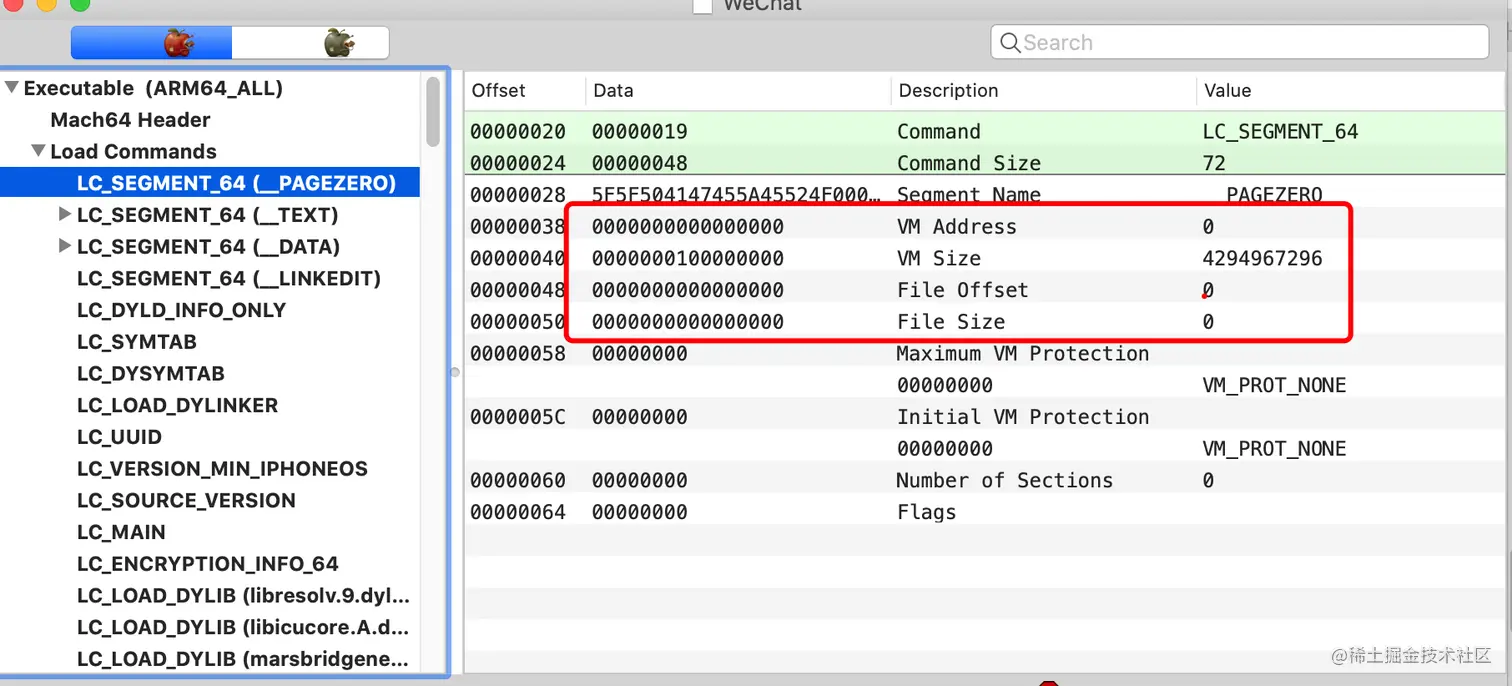 在Load Commands中存储了各种段的基本信息,下面以LC_SEMENT_64(__PAGEZERO)中的信息为例