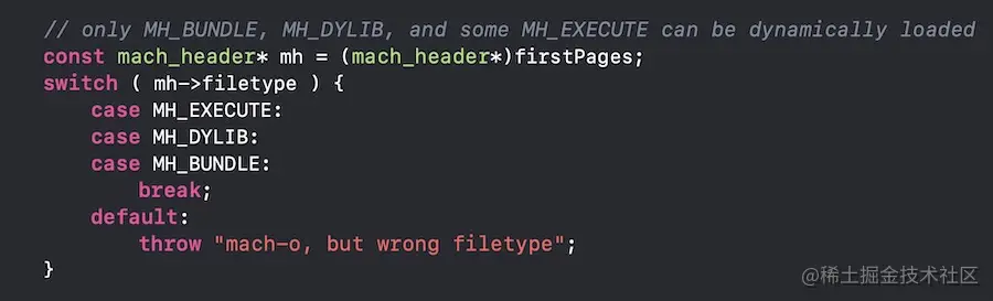 通过查看dyld的源码可以看到加载文件时的类型校验