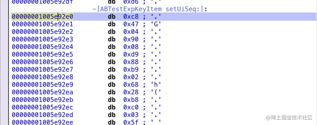 上图中函数test的起始地址是0x5e92e0,也就是说它的File Offset为0x5e92e0。这个是它在Mach-O文件中的地址偏移。
