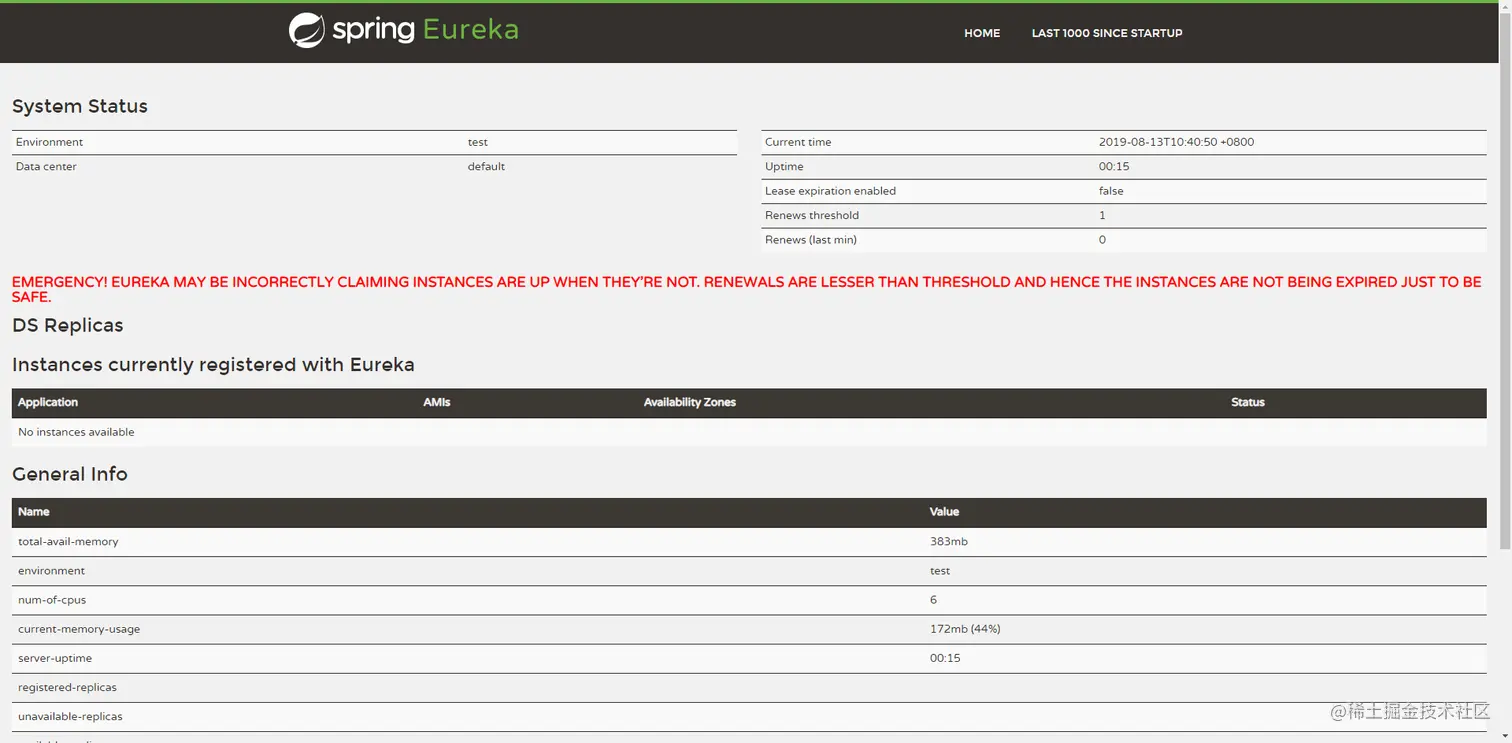 启动工程后,访问:http://localhost:8080/,就能看到一个图形化的管理界面,目前没有注册任何服务。