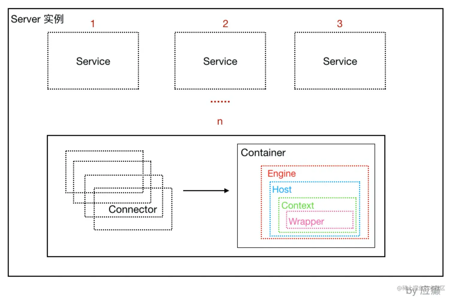 其实,可以认为整个Tomcat就是⼀个Catalina实例,Tomcat启动的时候会初始化这个实例,Catalina实例通过加server.xml完成其他实例的创建,创建并管理⼀个Server,Server创建并管理多个服务(Service),每个服务(Service)⼜可以有多个Connector和⼀个Container。