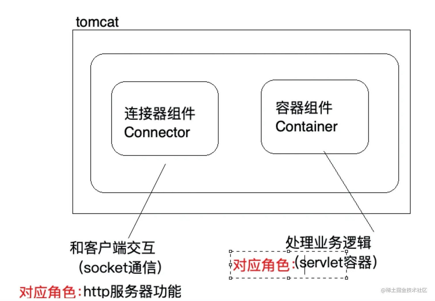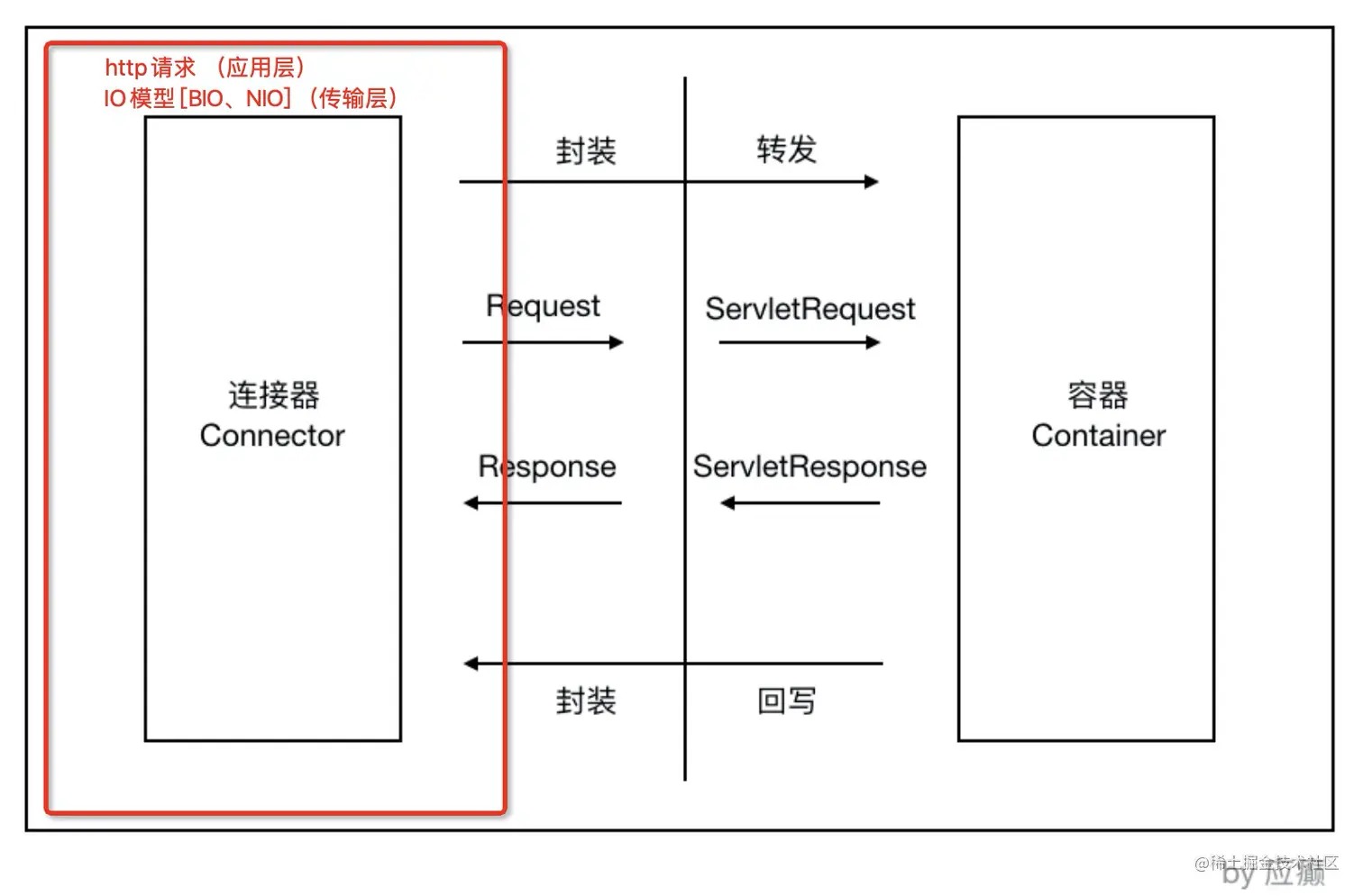 - 连接器:负责对外交流,处理Socket连接,负责网络字节流和Request/Response对象的转化;