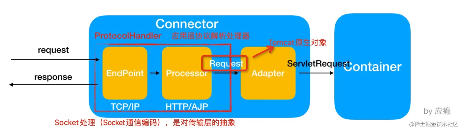 | Processor | Processor是Coyote的协议处理接口,用来实现HTTP协议,Processor接收来⾃EndPoint的Socket,读取字节流解析成Tomcat Request和Response对象,并通过Adapter将其提交到容器处理,Processor是对应⽤层协议的抽象 |