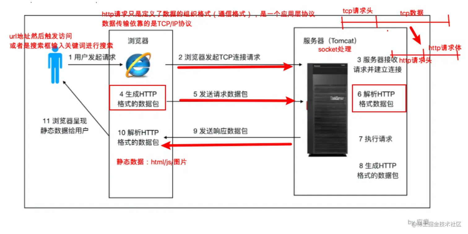 浏览器访问服务器使用的是Http协议,Http协议是应用层协议,用于定义数据通信的格式,具体的数据传输使用的是TCP/IP协议。