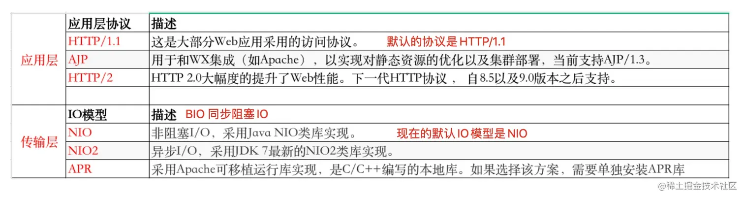 **Tomcat (Coyote)**支持多种应用层协议和I/O模型: