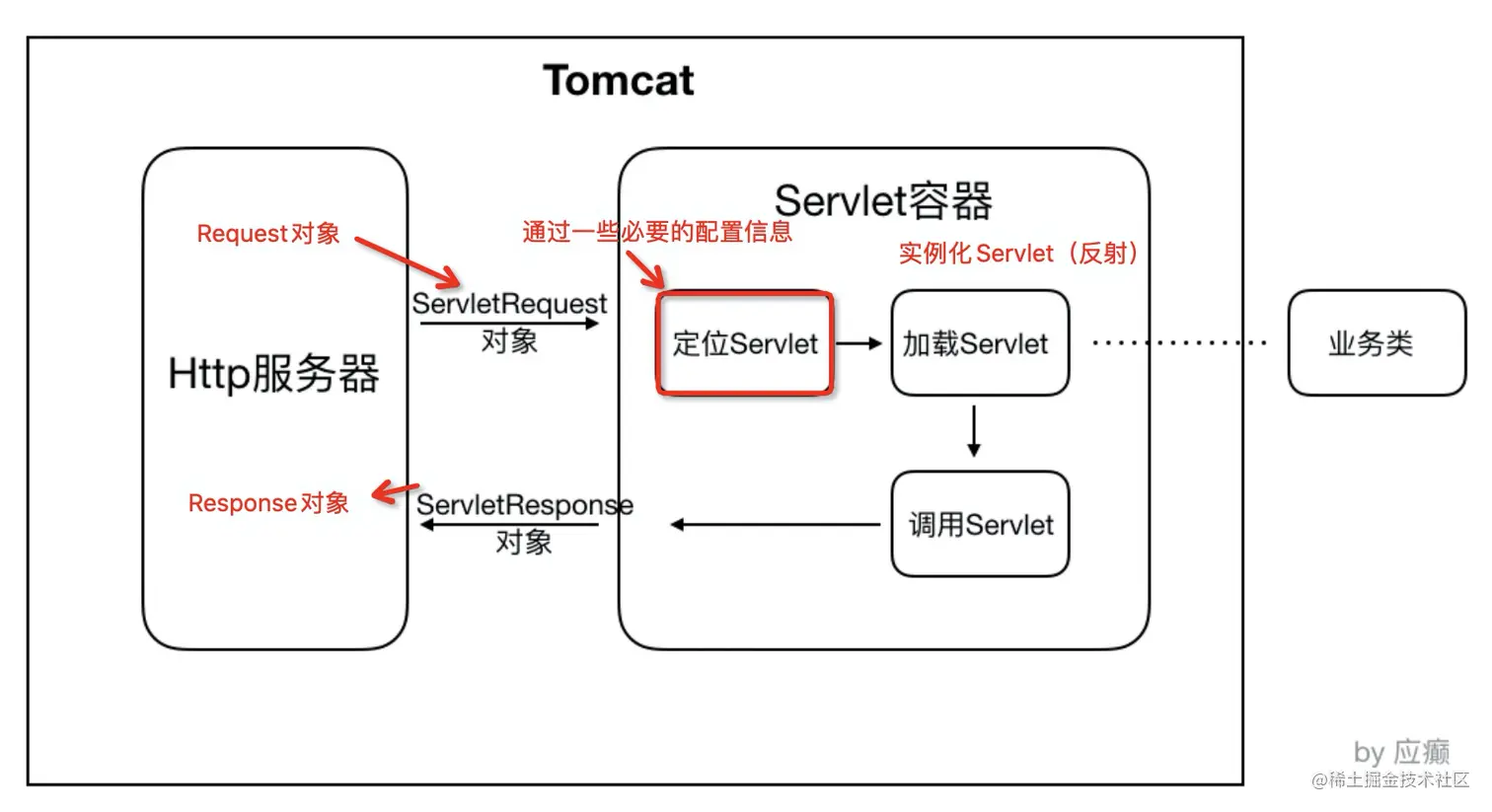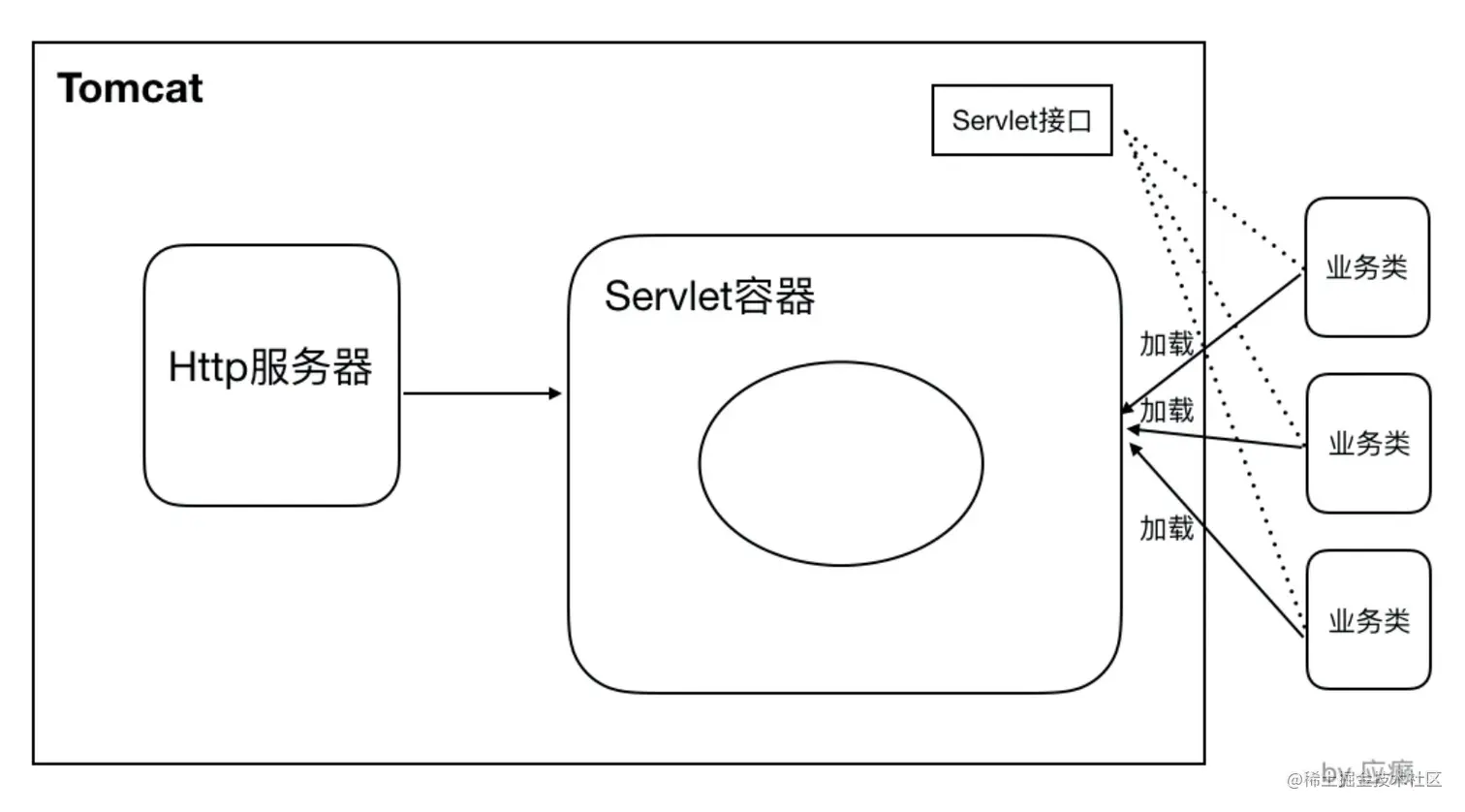 HTTP服务器接收到请求之后把请求交给Servlet容器来处理,Servlet容器通过Servlet接⼝调⽤业务类。