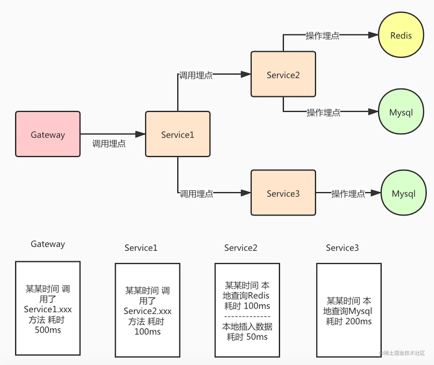 从上图可以看出,一个请求经过了多个服务,每个服务中对远程调用或者本地调用都有埋点,这样就能监控到调用的异常和性能指标。