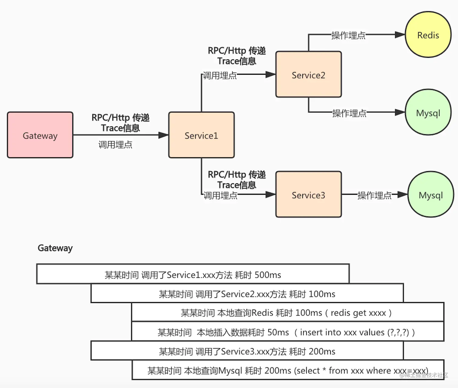 要想将整个请求都串连起来,必须要有一个唯一的请求标识,一般我们称之为 traceId。剩余的工作就是将链路相关的信息层层传递下去。