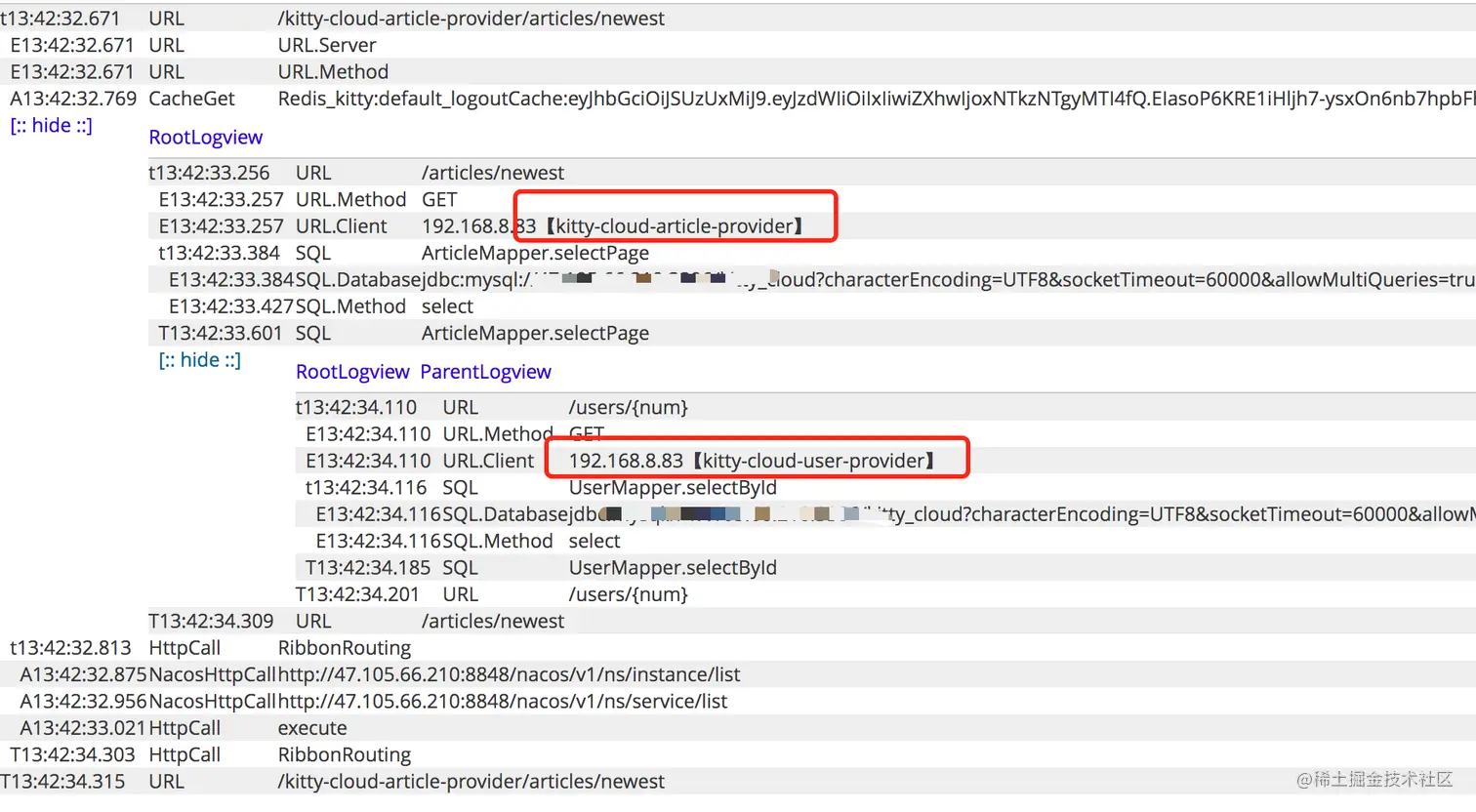 最终的效果如下图,调用了 articles/newest 接口,网关将请求转发到 article-provider 服务,article-provider 中又调用了 user-provider 的 users/uid 接口获取用户信息,最重要的是 user-provider 中有哪些操作的耗时在这里也能直观的看到,非常方便。