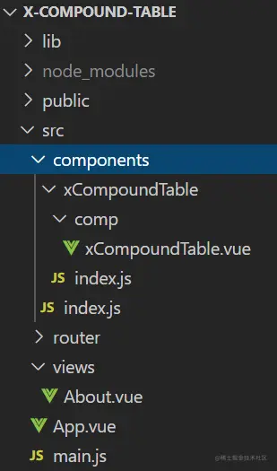 这个单个组件的注册文件,也是入口文件。我现在是一个组件一个文件夹,存放每个组件单独的开发目录,例如xCompoundTable,里面就会有一个组件的入口文件index.js,内容如下,注册了组件: