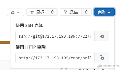 例如在我们例子里,22 映射到 10022,80 映射到 10080。可以看到在 Gitlab 默认的 WebUI 中,项目显示的克隆地址默认是不带端口号的,如下图所示: